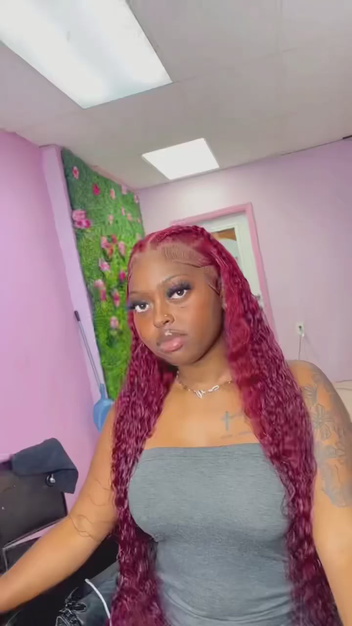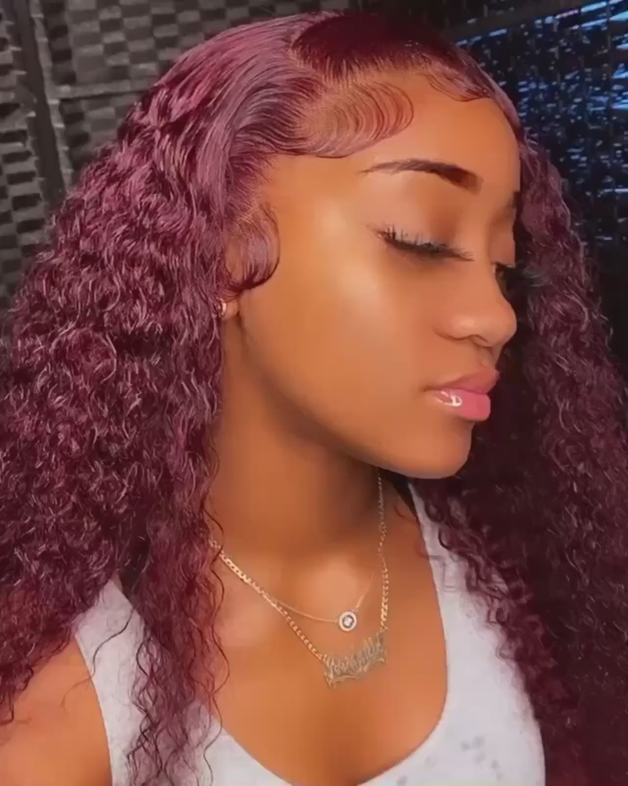 đ· Perruque BouclĂ©e Bordeaux â Lace Front HD 13x4 / 13x6 â Deep Wave 99J